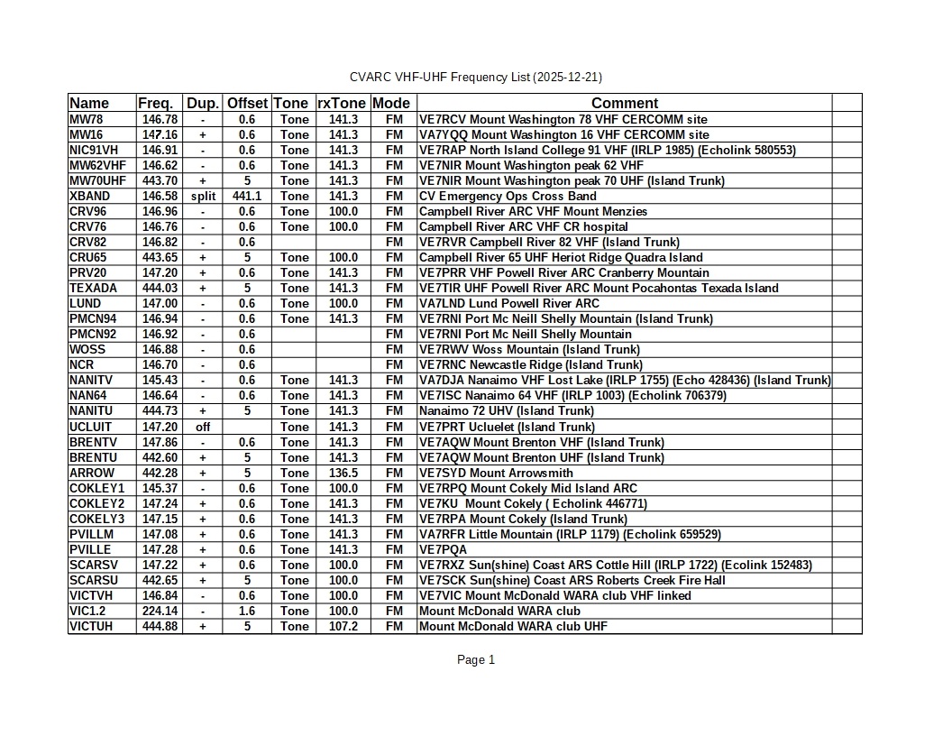 Here are some links to a list of Salish Sea repeaters, logging road and marine frequencies.
